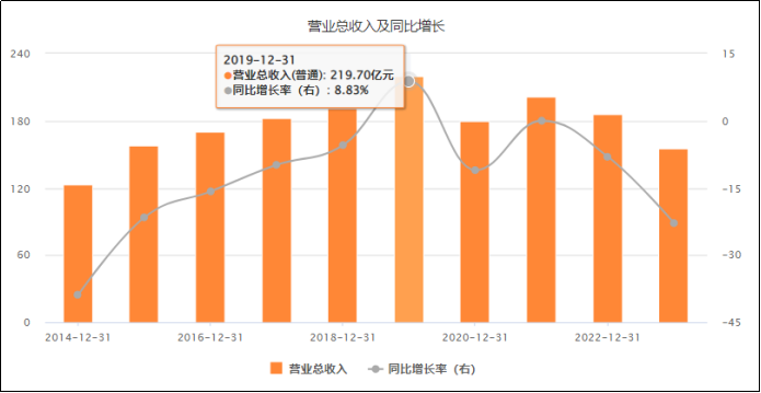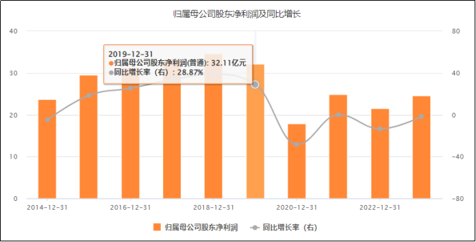 2014年海澜之家借壳凯诺科技在A股上市,当年归属母公司股东净利润同比大增75.83%,达到23.75亿元,同比增速是上市以来最快,但后面就出现了明显的增长乏力,从2014年到2019年,公司营收增速CAGR仅有10%,虽然在2019年公司营收首次突破200亿大关,达到219.7亿,但当年却是增收不增利,全年归母净利润下滑7.1%。