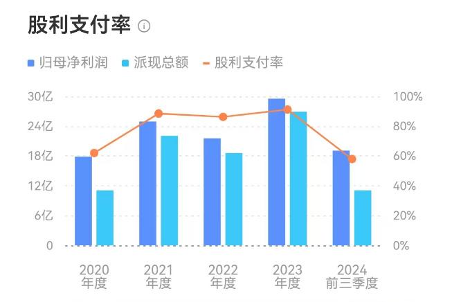 数据显示,2022年归母净利润21.55亿元,现金分红18.57亿,分红比例高达86.2%;到了2023年,归母净利润29.52亿元,现金分红26.9亿元,分红比例超过了91%,哪怕2024年中期分红,现金分红比例也接近58%。