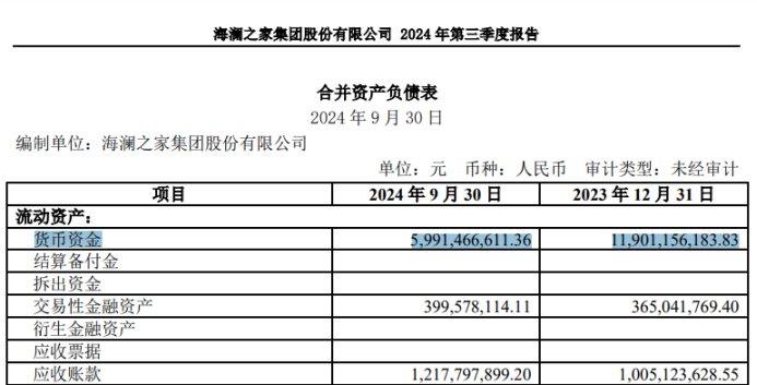 据2024年三季报显示,至9月底海澜之家的在手货币资金为59.91亿元,较上年同期减少了39%,较2024年初的119亿元更是减少了一半!