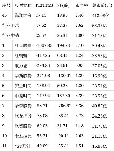 从行业市盈率排名来看,公司所处的纺织服装行业市盈率平均47.62倍,行业中值25.57倍,海澜之家排名第46位。