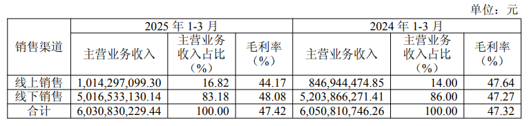 一季度中,海澜之家线下销售收入合计50.17亿元,毛利率48.08%;线上销售收入合计10.14亿元,毛利率44.17%。