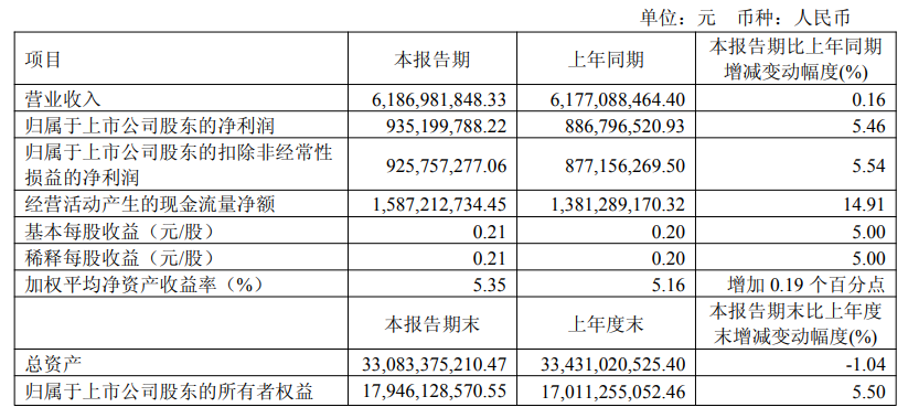 截至2025年3月31日,一季度营业收入为61.87亿元,比上年同期增长0.16%;归属于上市公司股东的净利润为9.35亿元,比上年同期增长5.46%。