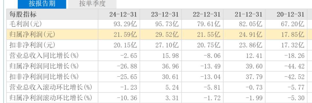 进入2025年4月下旬,发布2024年年报的A股上市公司占总数的90%以上。直至4月30日,国内服装行业头部上市公司海澜之家的财报才姗姗来迟,2024年海澜之家营收209.6亿元,同比下滑2.65%;净利润21.59亿元,同比下滑26.88%。