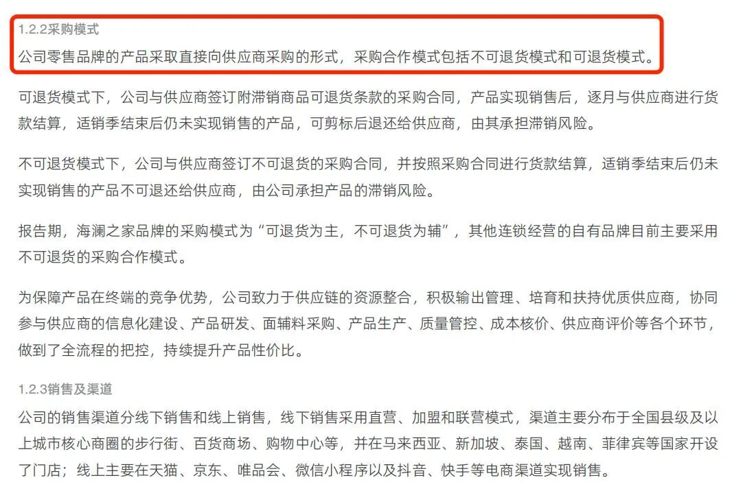 与此同时,海澜之家的采购模式还分为可退货和不可退货两种模式: