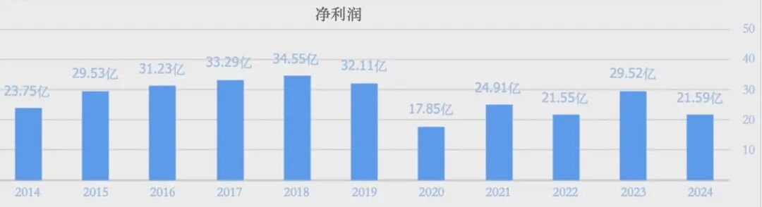 2020年被认为是海澜之家发展的“分水岭”,这一年海澜之家业绩从巅峰跌落。2021-2024年,海澜之家的营收分别为201.88亿元、185.62亿元、215.28亿元、209.57亿元,收入波动较为频繁。同期净利润则分别为24.91亿元、21.55亿元、29.52亿元、21.59亿元。最新年度净利润已经退回到2014年借壳前的水平。