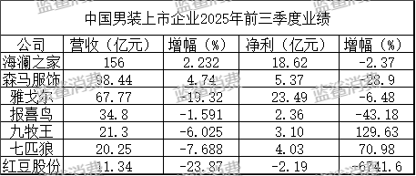 男装消费市场也下滑严重。从2025年前三季度财报来看,知名男装上市公司中,仅有 海澜之家 和 森马服饰 营收增长,增幅分别为2.2%和4.7%;大多数男装上市公司“增收不增利”,仅有 九牧王 和 七匹狼 净利同比增长。