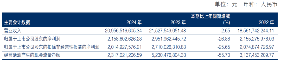 从营收规模看,近年来海澜之家营收规模始终在200亿元徘徊。2024年全年营收209.57亿元,同比下降2.65%;归母净利润21.59亿元,同比大跌26.88%。