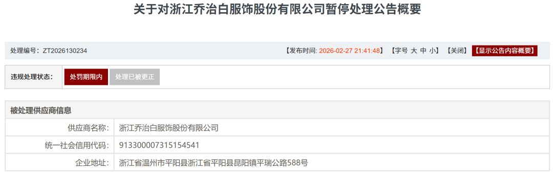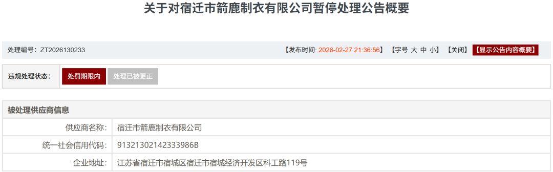 同期被处罚的还有浙江乔治白服饰、宿岸市箭鹿制衣等多家服装企业,均因“中标后无正当理由拒不签订合同”被同等处罚。