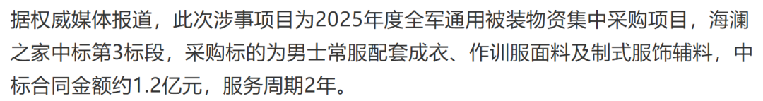 据《新消费财研观》等多家媒体报道,此次涉事项目为2025年度全军通用被装物资集中采购项目,海澜之家中标第3标段,采购标的为男士常服配套成衣、作训服面料及制式服饰辅料,中标合同金额约1.2亿元,服务周期2年。