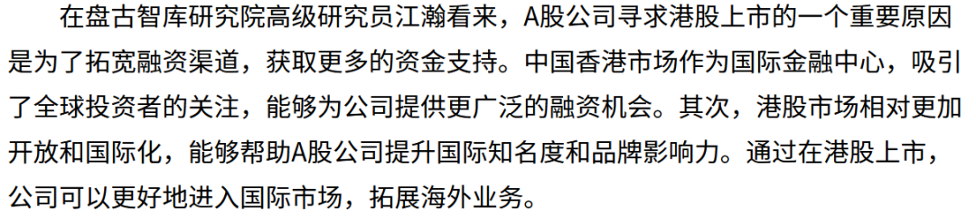 海澜之家在招股书中将赴港上市的理由表述为,“为深化公司全球化战略布局,加快海外业务发展,提升公司国际化品牌形象,同时打造多元化资本运作平台,进一步增强公司资本实力,助力公司高质量发展”。据《北京商报》报道,盘古智库研究院高级研究员江瀚认为,“A股公司寻求港股上市的一个重要原因是为了拓宽融资渠道,获取更多的资金支持。”