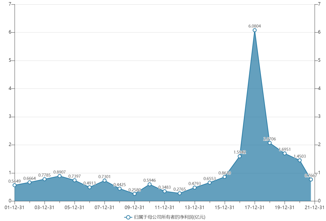 小强统计了红豆股份2001年上市以来净利润情况可以看到,公司历史最高净利润是在2017年,达到6.1亿,不过主要是当年的股权出售导致的非经常性损益带来的。