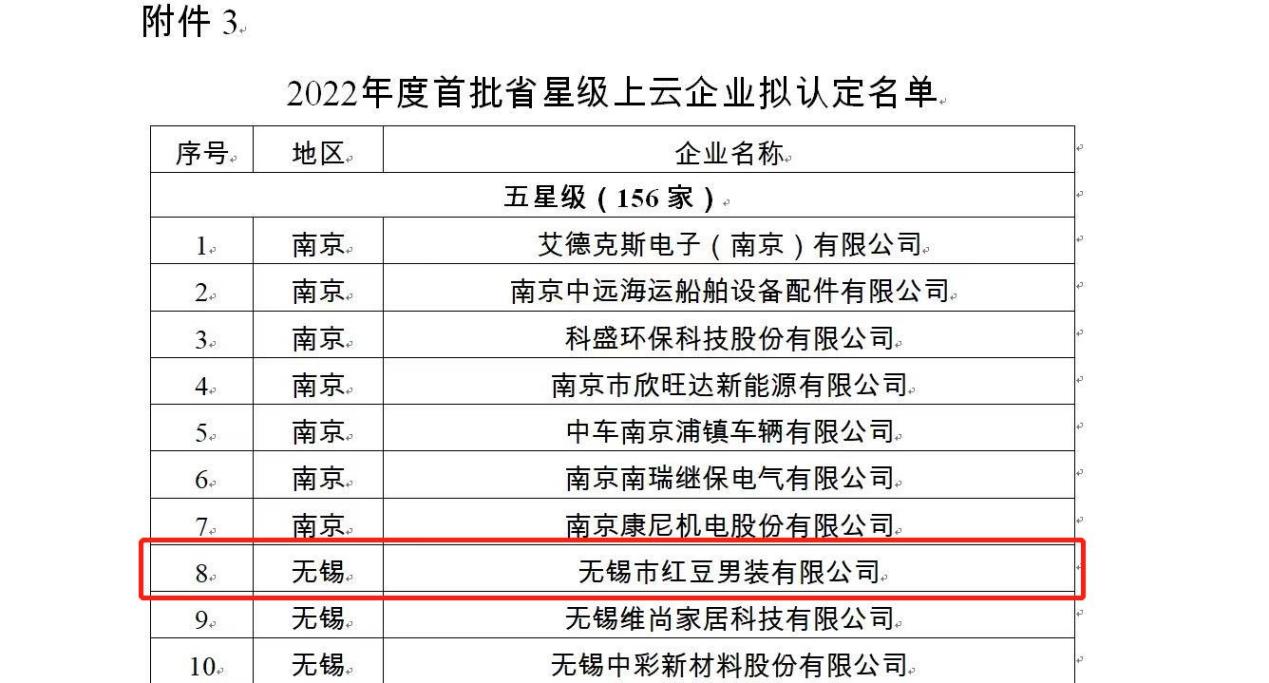 7月,江苏省工业和信息化厅公布“关于2022年度省工业互联网示范工程项目和两化融合管理体系贯标试点企业培育对象拟认定名单的公示”。红豆股份旗下无锡市红豆男装有限公司拟被认定为江苏省首批星级上云企业。