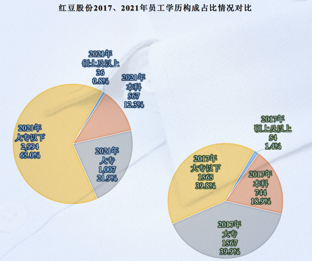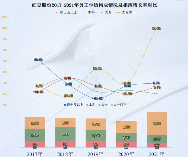 我个人理解是这样的,其整个管理团队都是在精简,所以各个学历的员工其实都在下降,这是其公司发展进入成熟期的整体大方向,也和社会大环境一致。同时,在大环境和行业等影响下,红豆股份在进行自己的直销模式发展战略,那么销售人员(主要是大专以下学历)这类员工在销售战略的推动下,出现了增长。两种发展模式结合,就成了上述综合性的变化了。