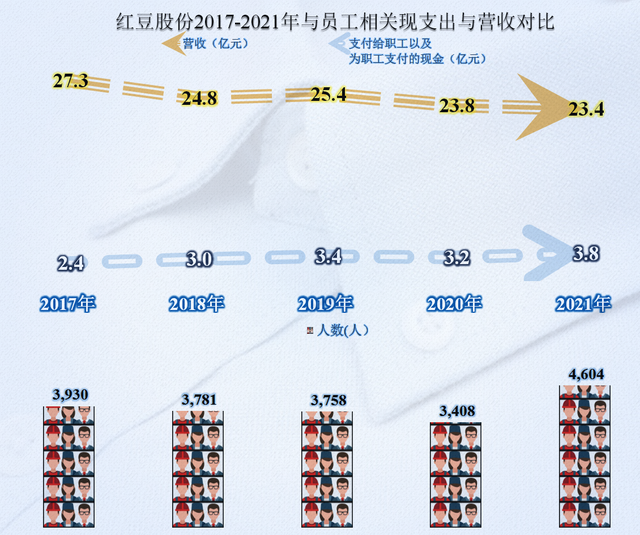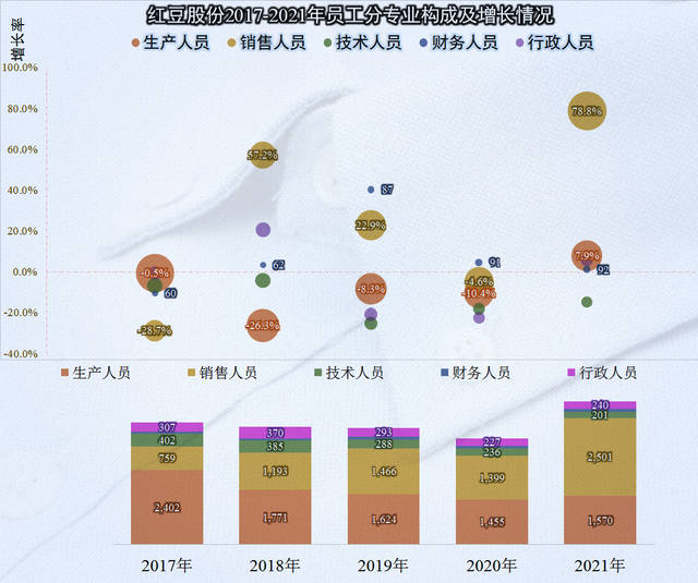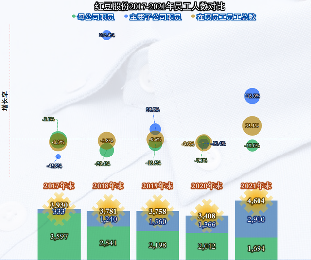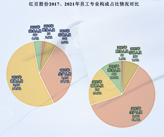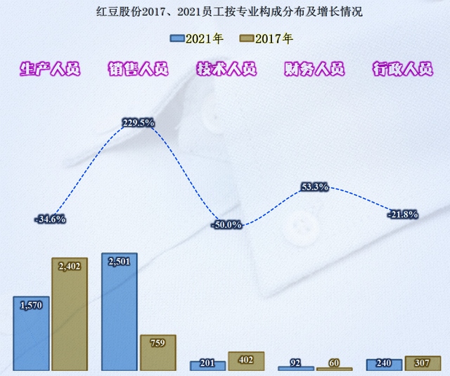 我们就一口气把这种增减变化给搞明白,2017年末,红豆股份是以生产人员为主,占比达到了61.1%,当时的销售人员占比为19.3%;而2021年末,就已经是销售人员为主,占比达到了54.3%,而生产人员占比下降至34.1%。