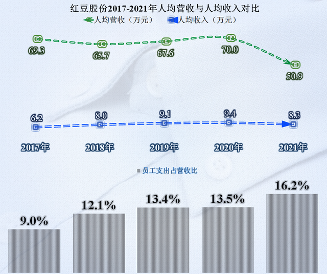 员工人数和营收都在下降,人均营收在2018年下降后,回升了两年,在2020年达到70万元的峰值,2021年开始大幅下降至50.9万元。人均员工相关的支出,从2017年的6.2万元,持续上升至2020年的9.4万元,2021年下降至8.3万元。