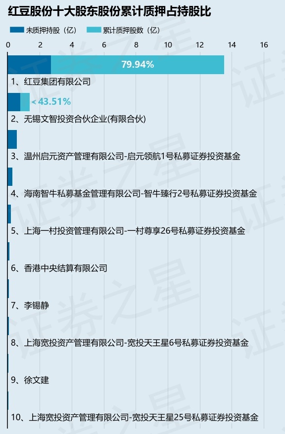 截止本公告日,股东红豆集团有限公司已累计质押股份10.81亿股,占其持股总数的79.94%,股东无锡文智投资合伙企业(有限合伙)已累计质押股份6005.0万股,占其持股总数的43.51%。本次质押后红豆股份十大股东的累计质押股份占持股比例见下图: