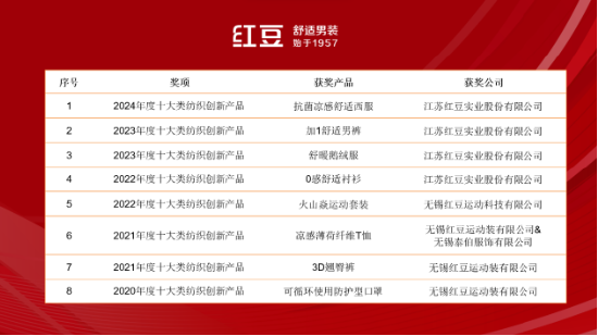 自2017年开始,中国纺织工业联合会每年面向服装、家纺和产业用三大终端领域持续开展“十大类纺织创新产品培育和推广”专项工作。盘点近五年获奖名单,红豆股份及子公司的“抗菌凉感舒适西服”、“加1舒适男裤”、“舒暖鹅绒服”、“0感舒适衬衫”、“火山焱运动套装”等产品纷纷入选。