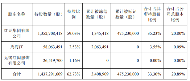 根据公司9月23日发布的风险提示公告,公司控股股东红豆集团有限公司(以下简称“红豆集团”)持有公司股份1,352,708,418股,占公司总股本的59.03%;红豆集团及其一致行动人周海江、无锡红闳服饰有限公司合计持有公司股份1,437,291,609股,占公司总股本的62.73%。截至公告日,公司控股股东红豆集团累计质押股份占其所持有公司股份总数的99.90%,占公司总股本的58.98%。红豆集团及其一致行动人合计已质押股份占其所持有公司股份总数的 95.48%,占公司总股本的 59.89%。也就是说,红豆集团几乎将所持红豆股份全部质押进行担保融资。