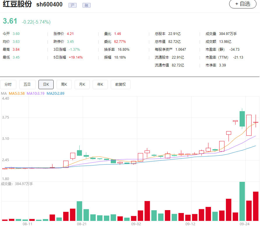 对于红豆股份的热度,市场也已分化。9月25日,公司低开低走,最终收跌5.74%。目前公司股价3.61元/股,总市值82.72亿元。