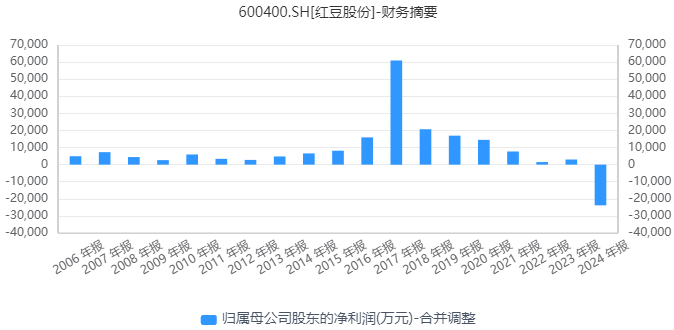 红豆股份自上市后到2016年和2017年前后,营收整体上行,但增收不增利,归母净利润并不同步,涨跌波动明显,但始终没有突破1亿元。此后,公司的业绩整体处于下行区,营收和净利润均逐步减少。2017年,公司归母净利润暴涨到6.1亿元,第二年便断崖式下滑至2.07亿元,接下来的几年仍然不断下滑,2002年跌至1503.94万元,2024年更是录得亏损2.38亿元,同比下降893.8%,这是上市后的首次年度亏损,业绩跌至谷底,公司持续承压。