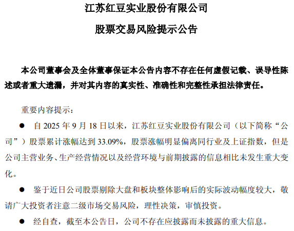 近日,此前股价相对平稳的红豆股份突然迎来大涨。9月18日、19日、22日均实现涨停,23日有所调整,但是24日公司股价再次收获涨停。为此,公司期间发布了异动公告和风险提示公告。公司表示,经查,公司日常经营活动正常,内外部环境未发生重大变化,不存在应披露而未披露的重大信息。公司、控股股东及实际控制人不存在正在筹划涉及公司的重大资产重组、股份发行、重大交易类事项等重大事项。经公司核实,公司不存在可能或已经对公司股票交易价格产生影响的媒体报道或市场传闻,不涉及热点概念事项等。公司董事、高管、控股股东及其一致行动人在公司股票异常波动期间不存在买卖公司股票的情况。