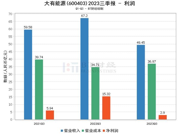 在利润方面,大有能源2023年三季度的营业收入为49.45亿元,相较于上年同期的67.2亿元有所下降。营业成本为36.97亿元,较上年同期的34.71亿元有所增加。公司的毛利率为25.23%,较上年同期的48.35%大幅下降。净利润为2.9亿元,相较于上年同期的15.32亿元大幅减少。净利率为5.87%,较上年同期的22.8%大幅下滑。这些数据的变动主要是由于公司受复杂地质条件和火灾事故的影响,导致部分矿井采掘接替紧张和商品煤产量下降,以及国内煤炭供给增长,需求不及预期,煤炭市场供需宽松,导致商品煤销量和售价下降。