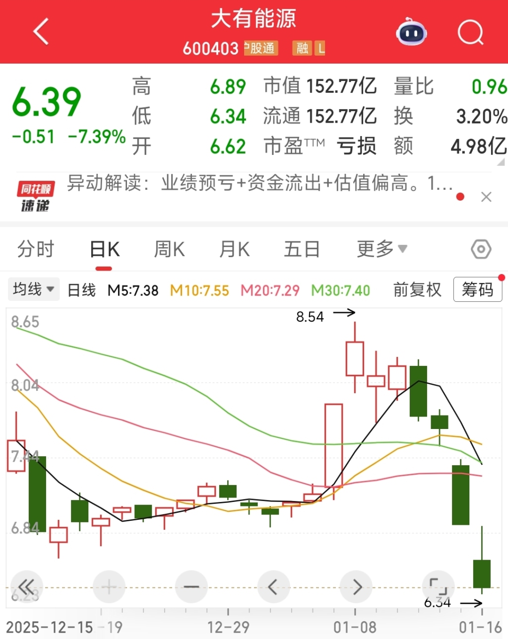 与此同时,大有能源近期股价出现显著波动。截至1月16日,公司股票在近四个交易日内累计跌幅达22%。对此,大有能源方面解释称,主要受近日披露的2025年度业绩预亏公告影响。