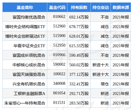 根据2021年报基金重仓股数据,重仓该股的基金共349家,其中持有数量最多的基金为富国均衡优选混合。富国均衡优选混合目前规模为61.21亿元,最新净值0.8625(3月22日),较上一日下跌0.32%,近一年下跌9.57%。该基金现任基金经理为杨栋。杨栋在任的公募基金包括:富国低碳新经济混合A,管理时间为2015年12月18日至今,期间收益率为200.07%;富国清洁能源产业混合A,管理时间为2020年3月6日至今,期间收益率为99.12%;富国积极成长一年定开混合,管理时间为2020年6月15日至今,期间收益率为33.15%;