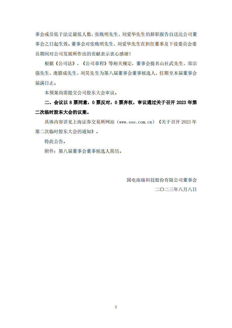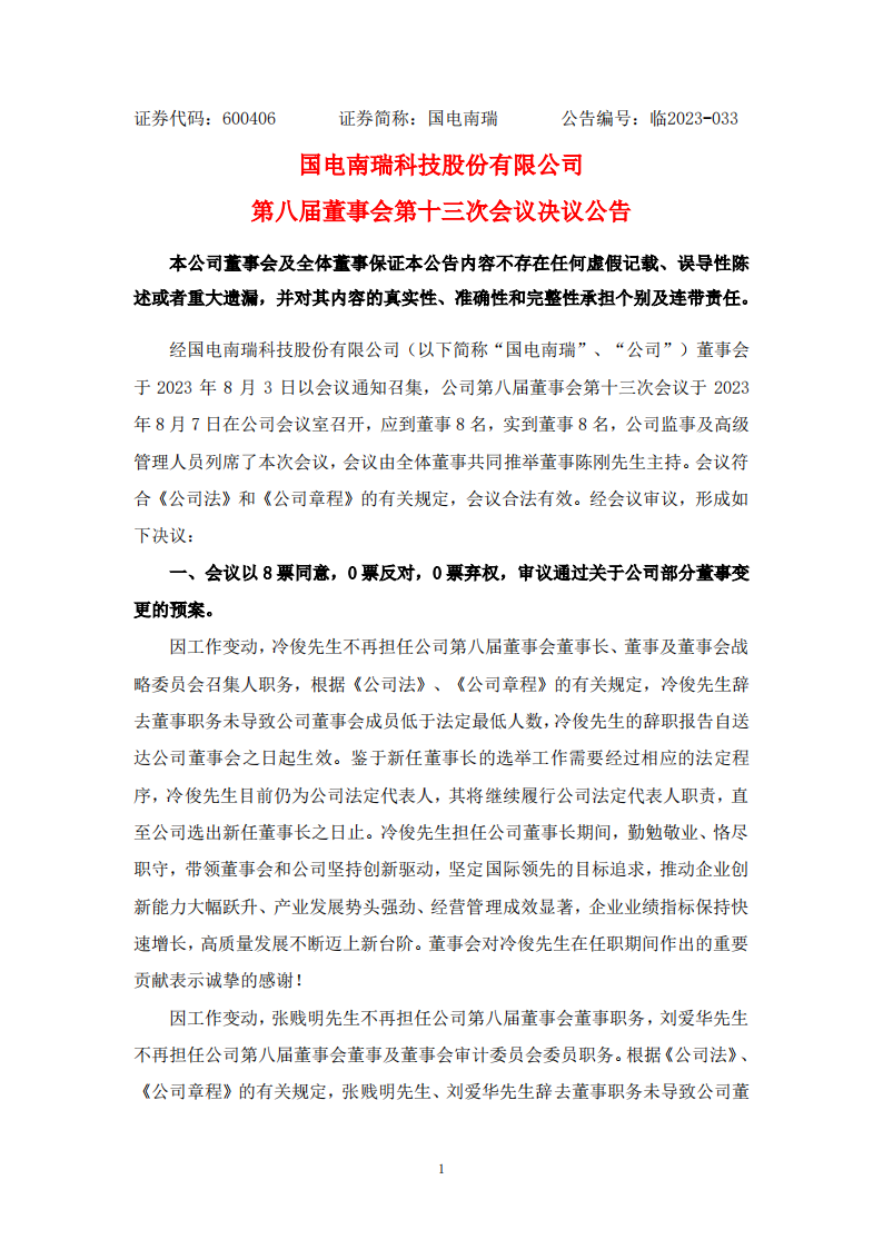 8月8日,国电南瑞发布《国电南瑞第八届董事会第十三次会议决议公告》。会议审议通过了关于公司部分董事变更的预案。