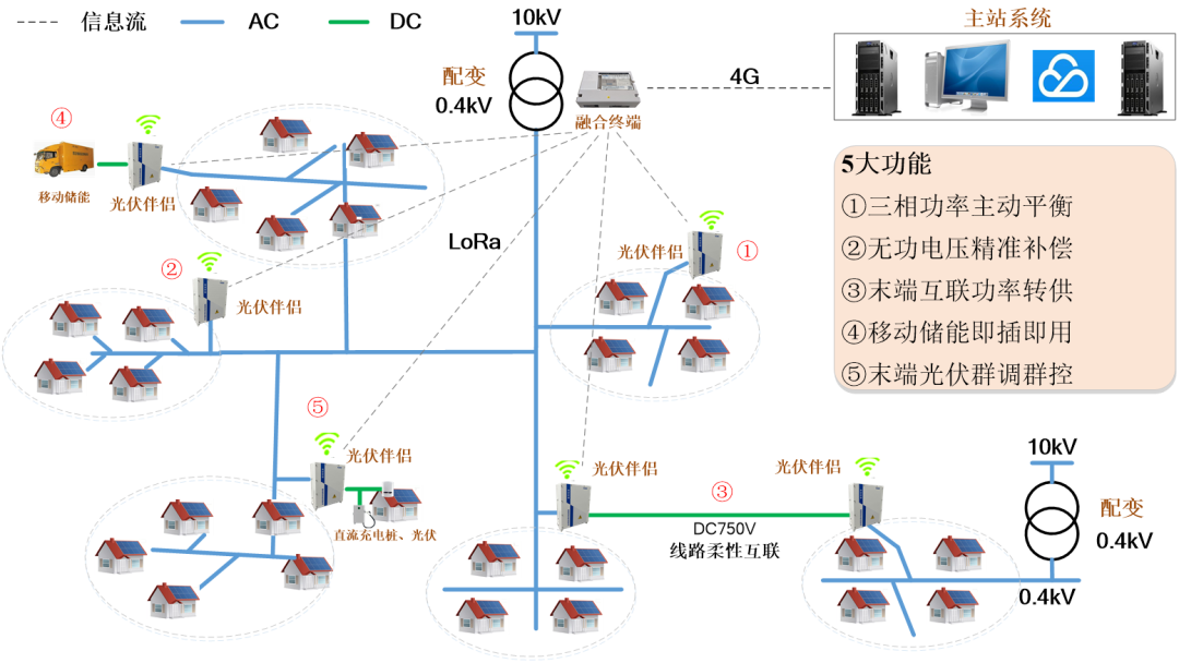 “光伏伴侣”装置采用了先进算法,具备三相功率主动平衡、无功电压精准补偿、末端线路互联功率转供、移动储能即插即用并网、分布式光伏群调群控自治5大核心功能。