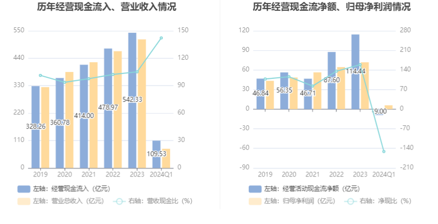 2024年第一季度,公司营业收入现金比为142.27%,净现比为-151.12%。