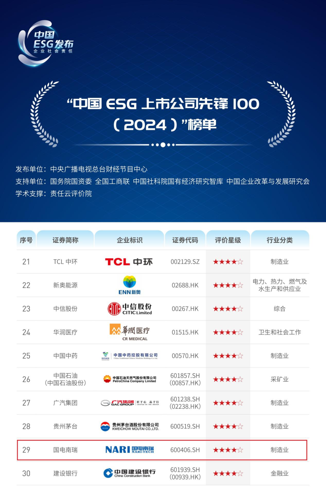《2024年度ESG行动报告》以A股与港股6471家上市公司为样本空间,对标多个国内外标准指引与评价体系,构建了包括3个一级指标、20个二级指标、122个三级指标的通用指标体系,编制形成“中国ESG上市公司先锋100”榜单(2024),国电南瑞等100家上市公司入选。
