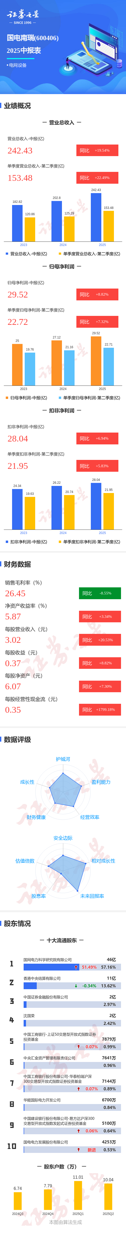 国电南瑞2025年中报显示,公司主营收入242.43亿元,同比上升19.54%;归母净利润29.52亿元,同比上升8.82%;扣非净利润28.04亿元,同比上升6.94%;其中2025年第二季度,公司单季度主营收入153.48亿元,同比上升22.5%;单季度归母净利润22.72亿元,同比上升7.33%;单季度扣非净利润21.95亿元,同比上升5.84%;负债率41.89%,投资收益1.07亿元,财务费用-1.31亿元,毛利率26.45%。