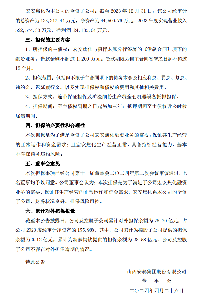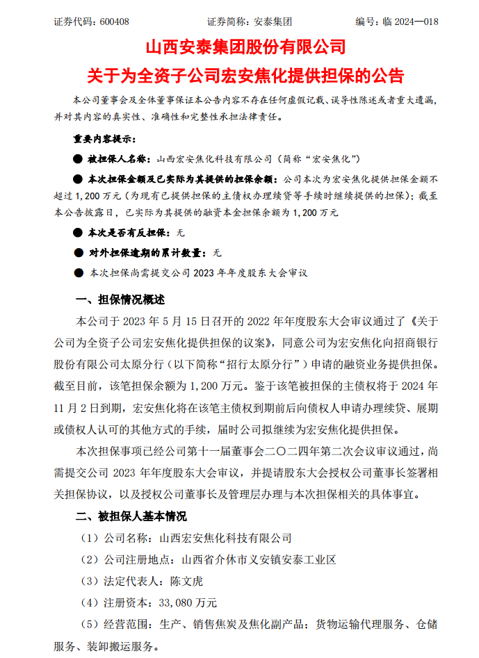 国际能源网获悉,近日,安泰集团发布为全资子公司宏安焦化提供担保的公告。公司于 2023 年 5 月 15 日召开的 2022 年年度股东大会审议通过了《关于公司为全资子公司宏安焦化提供担保的议案》,同意公司为宏安焦化向招商银行股份有限公司太原分行(以下简称“招行太原分行”)申请的融资业务提供担保。截至目前,该笔担保余额为 1,200 万元。鉴于该笔被担保的主债权将于 2024 年11 月 2 日到期,宏安焦化将在该笔主债权到期前后向债权人申请办理续贷、展期或债权人认可的其他方式的手续,届时公司拟继续为宏安焦化提供担保。