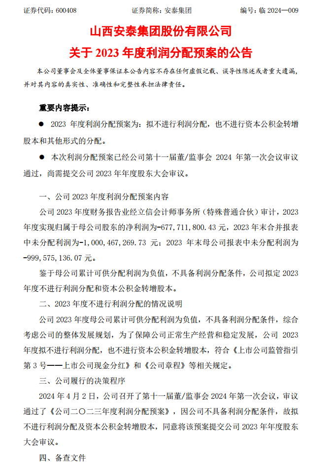 国际能源网获悉,近日,安泰集团发布关于2023年度利润分配预案的公告。2023年度实现归属于母公司股东的净利润为-677,711,800.43 元,2023 年末合并报表中未分配利润为-1,000,467,269.73 元;2023 年末母公司报表中未分配利润为-999,575,136.07 元。鉴于母公司累计可供分配利润为负值,不具备利润分配条件,公司拟定 2023年度不进行利润分配和资本公积金转增股本。