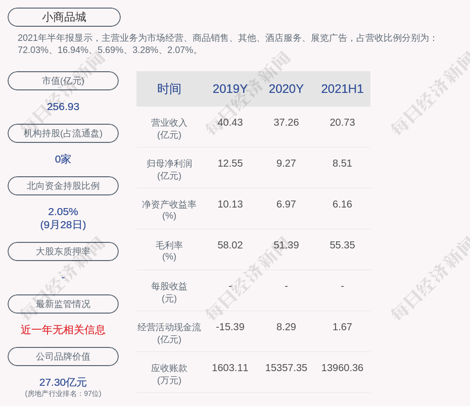 2021年半年报显示,小商品城的主营业务为市场经营、商品销售、其他、酒店服务、展览广告,占营收比例分别为:72.03%、16.94%、5.69%、3.28%、2.07%。