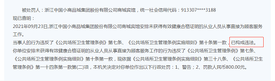 近日,义乌市卫生健康局对浙江中国小商品城集团股份有限公司(以下简称:“小商品城”,股票代码:600415.SH)商城宾馆警告并罚款800元,处罚事由为其安排未获得有效健康合格证明的从业人员从事直接为顾客服务工作。行政处罚决定书文号:义卫公罚[2021]786号。