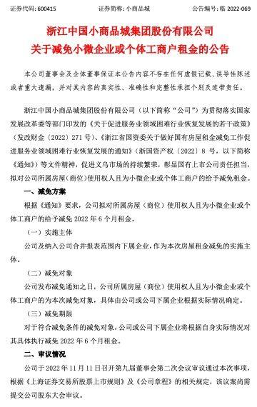 小商品城在公告中表示,浙江中国小商品城集团股份有限公司为贯彻落实国家发展改革委等部门印发的《关于促进服务业领域困难行业恢复发展的若干政策》、《浙江省国资委关于做好国有房屋租金减免工作促进服务业领域困难行业恢复发展的通知》等文件精神,促进义乌市场的持续繁荣,彰显国有上市公司责任担当,拟对公司所属房屋(商位)使用权人且为小微企业或个体工商户的给予减免租金。