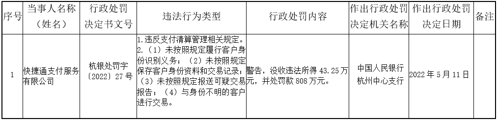 2022年5月,人民银行杭州中心支行发布的行政处罚信息显示,快捷通支付因违反支付清算管理相关规定、反洗钱相关管理规定(包括:①未按照规定履行客户身份识别义务;②未按照规定保存客户身份资料和交易记录;③未按照规定报送可疑交易报告;④与身份不明的客户进行交易等)被警告,没收违法所得43.25万元并处罚款808万元,合计罚没884.25万元。