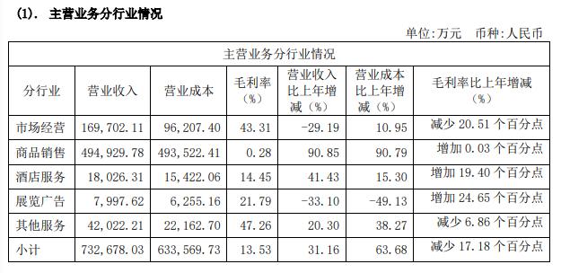 从毛利率上看,考虑到2022年市场经营业务受减免租金的影响,以及酒店服务、展览广告受疫情影响,毛利率较往年有较大幅度下降,主营业务毛利率下滑至13.53%。