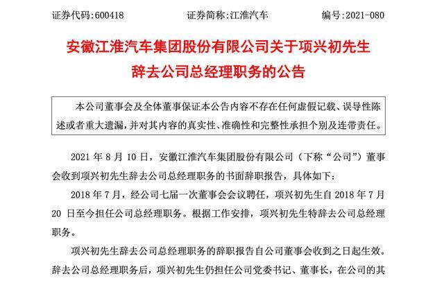 8月11日,江淮汽车发布公告:根据工作安排,项兴初辞去公司总经理职务,辞职报告自公司董事会收到之日起生效。