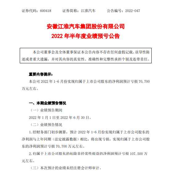 7月14日,江淮汽车发布2022半年度业绩预亏公告。公告显示,预计江淮汽车2022年1-6月实现归属于上市公司股东的净利润亏损7.07亿元左右。今年前6个月销售各类汽车及底盘23.52万辆,同比下降17.47%。