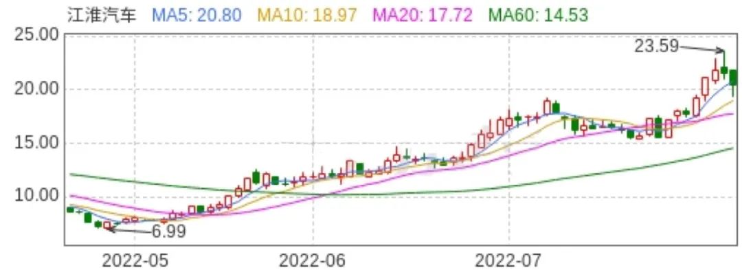 但对于江淮汽车而言,这仍属高位,公司股价已经历过一波大涨。4月底至7月初,江淮汽车的股价从低位6.99元/股一路攀升至18.95元/股,涨幅达到171%,与今日收盘价相比,涨幅更是高达192%。