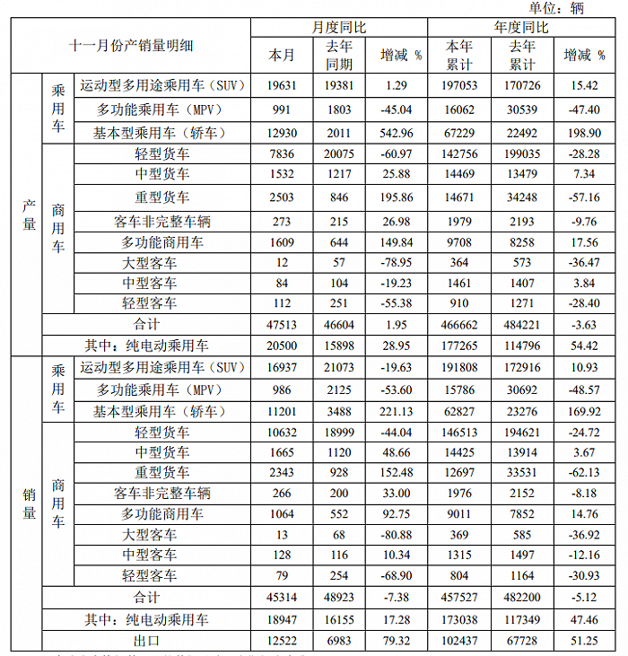 江淮汽车12月7日公告,2022年11月乘用车和商用车合计销量45314辆,同比下降7.38%;其中纯电动乘用车销量18947辆,同比增长17.28%。
