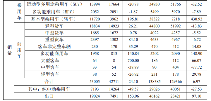 2023年1-3月,江淮汽车累计销售销售轻型货车44800辆,同比下降13.83%;销售中型货车4022辆,同比下降5.52%;销售重型货车4633辆,同比下降6.72%;销售多功能商用车5202辆,同比增长148.90%;销售大型客车186辆,同比增长66.07%;销售中型客车90辆,同比下降77.72%;销售轻型客车231辆,同比增长29.78%。