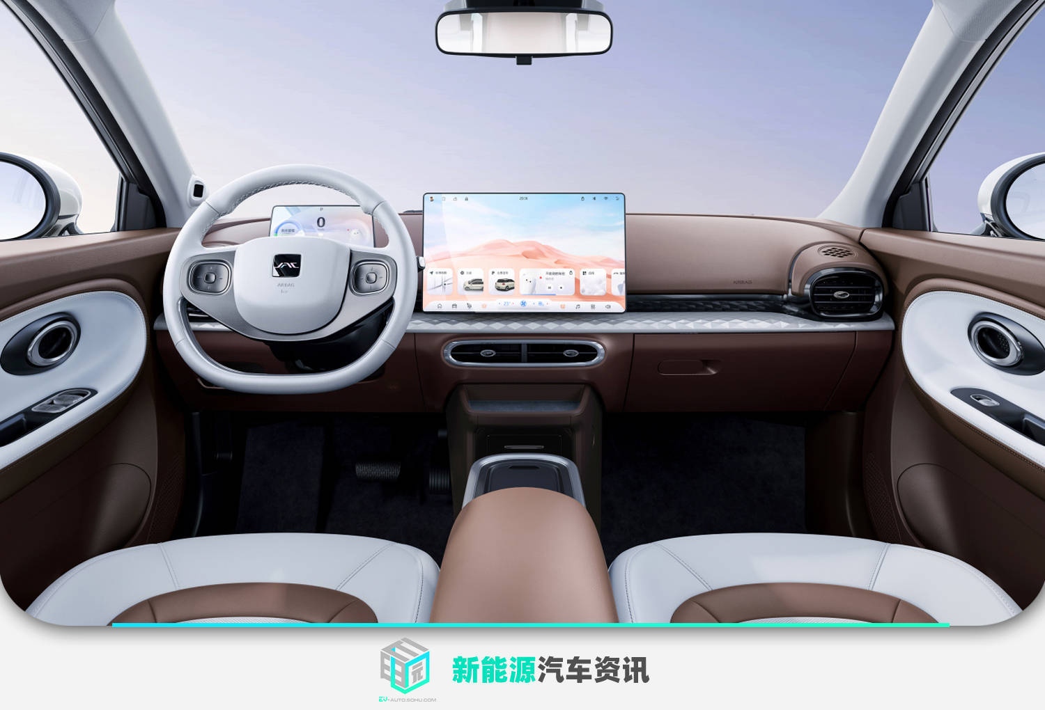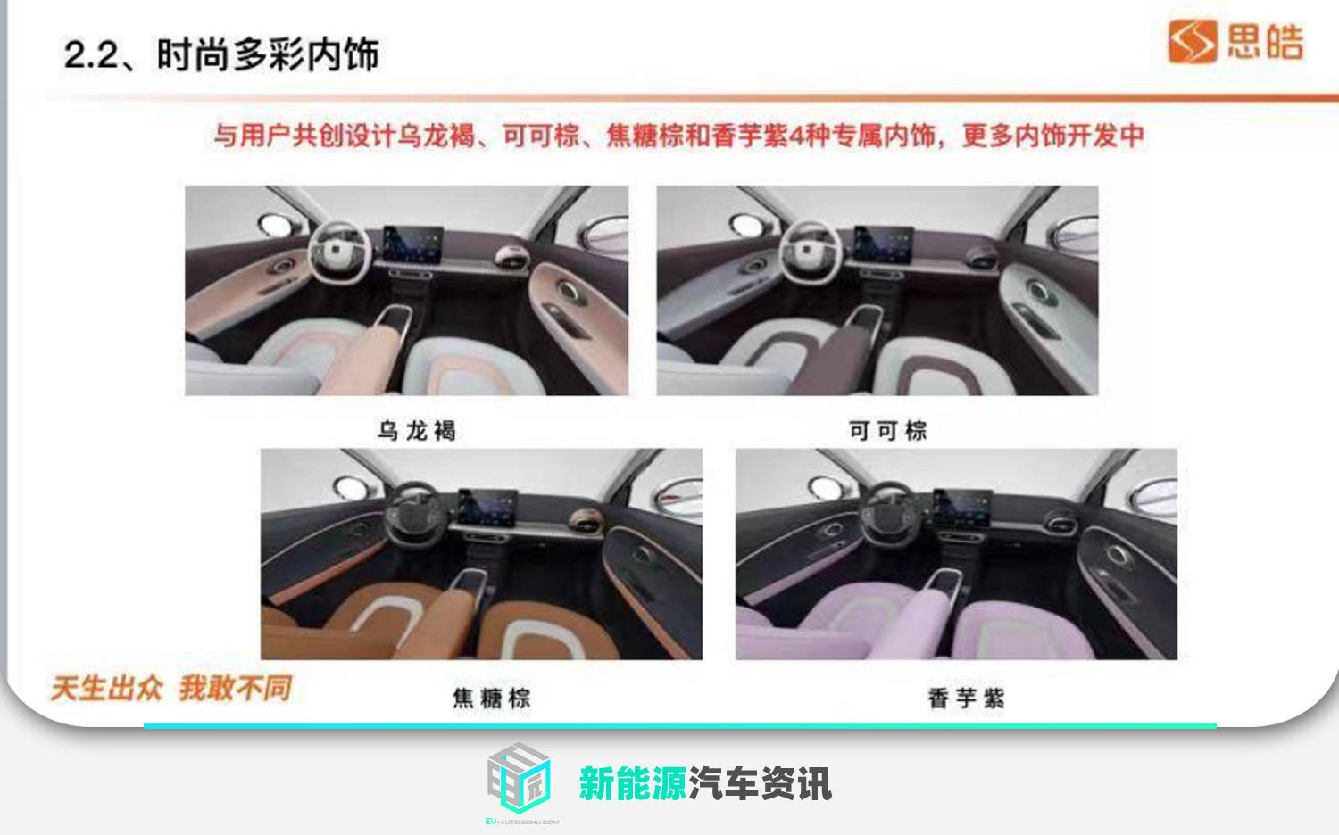 内饰方面,新车有乌龙褐、可可棕、焦糖棕、香芋紫四种颜色,内饰整个中控台面拥有一个贯穿式的水晶饰板,并拥有64色氛围灯,香氛系统。动力上,新车搭载最大功率70kW/100kW的永磁同步电机,最高车速150km/h;配备磷酸铁锂电池,全系标配0.5小时快充。