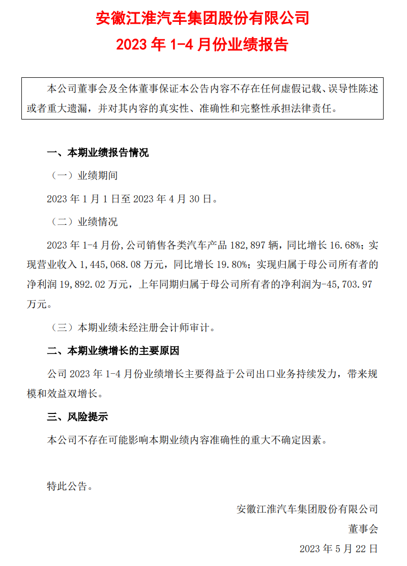 IT之家 5 月 22 日消息,江淮汽车发布 1-4 月份业绩报告,共销售各类汽车产品 182897 辆,同比增长 16.68%;实现营业收入 144.51 亿元,同比增长 19.80%;实现归属于母公司所有者的净利润 1.99 亿元,去年同期亏损 4.57 亿元。