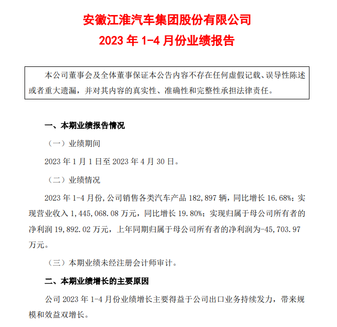 记者日前获悉,安徽江淮汽车集团股份有限公司(以下简称“江淮汽车”)5月21日公告,2023年1-4月,公司销售各类汽车产品18.29万辆,同比增长16.68%;实现营业收入144.51亿元,同比增长19.80%;实现归属于母公司所有者的净利润1.99亿元,上年同期为亏损4.57亿元。业绩增长主要得益于公司出口业务持续发力,带来规模和效益双增长。