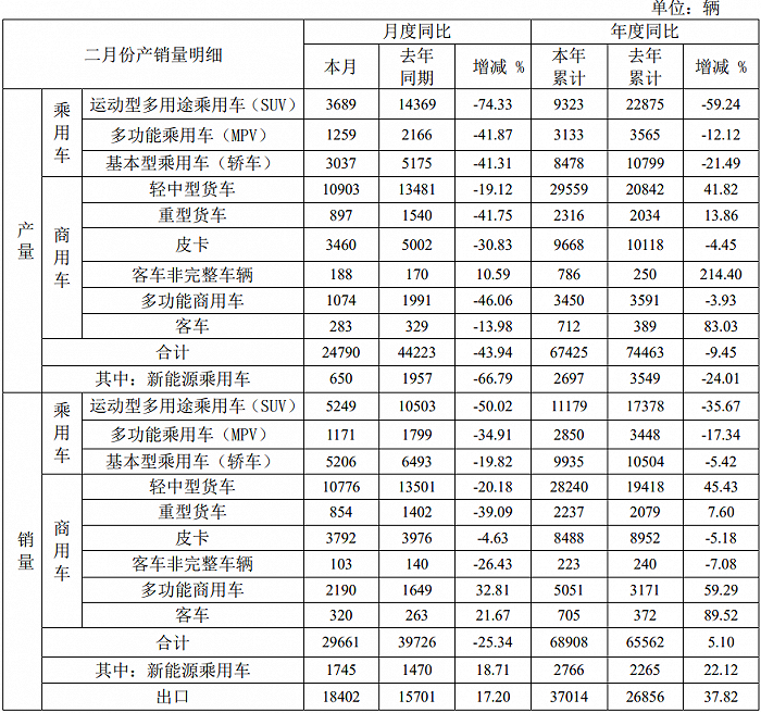 江淮汽车3月7日公告,2月合计销量29661辆,同比下降25.34%;1-2月合计销量68908辆,同比增长5.10%。