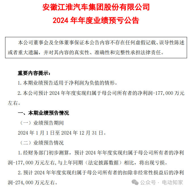 电动知家消息,1月25日,江淮汽车发布的业绩预告显示,预计2024年净亏损约 17.7 亿元,与上年同期(法定披露数据)相比,将出现亏损。预计2024年年度实现归属于母公司所有者的扣除非经常性损益后的净利润-27.4,亿元左右。